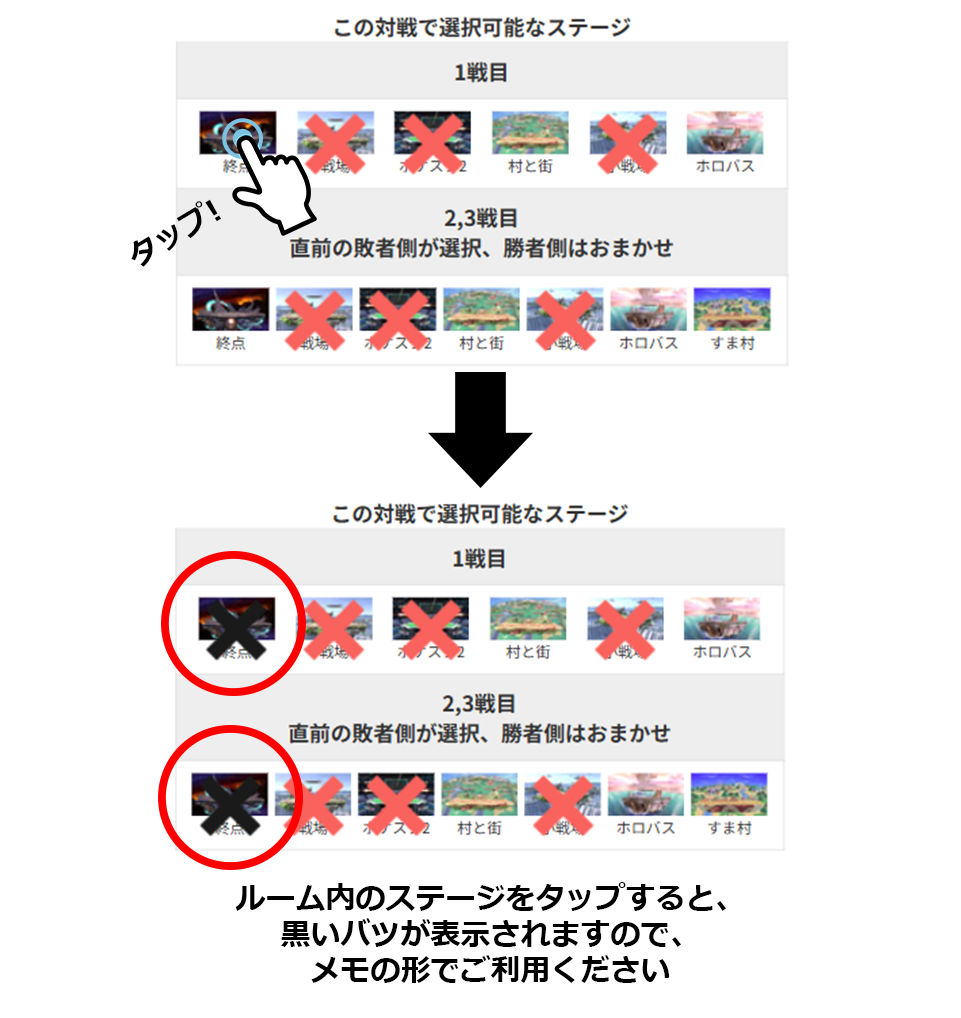 マッチングしたルーム内のステージリストをタップorクリックすると、該当ステージにバツ印が付きますので、1戦目に勝利したステージのメモなどで役立ててください。