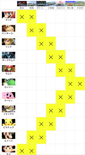 33.5期では、対戦相手が使用するキャラクターをサイト上で設定した上で進めるため(後述)、キャラクターに応じた拒否ステージが可能となっています。
