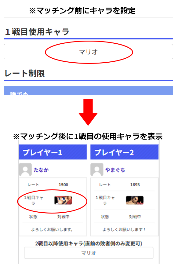 対戦相手が決まりましたら、1戦目は必ず選択したキャラクターを使用してください。つまり、マッチング前に対戦プレイヤーは不明なため、対戦プレイヤーに応じてキャラクターを変えることは不可能です。